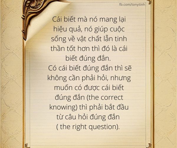 Cái biết mà nó mang lại hiệu quả, nó giúp cuộc sống về vật chất lẫn tinh thần tốt hơn thì đó là cái biết đúng đắn. Hãy luôn đi tìm cái biết đúng đắn, vì có cái biết đúng đắn thì sẽ không cần phải hỏi. Nhưng muốn có được cái biết đúng đắn (the correct knowing) thì phải bắt đầu từ câu hỏi đúng đắn ( the right question).