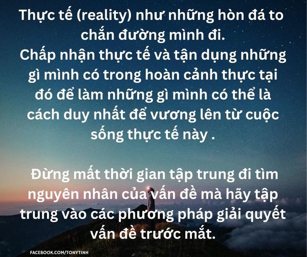 Chấp nhận thực tế và tận dụng những gì mình có trong hoàn cảnh thực tại đó để làm những gì mình có thể là cách duy nhất để vương lên từ cuộc sống thực tế này. Đừng mất thời gian tập trung đi tìm nguyên nhân của vấn đề mà hãy tập trung vào các phương pháp giải quyết vấn đề trước mắt.