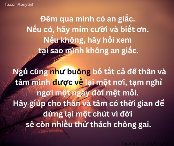 Đêm qua mình có an giấc. Nếu có, hãy mỉm cười và biết ơn. Nếu không, hãy hỏi xem tại sao mình không an giấc. Ngủ cũng như buông bỏ tất cả để thân và tâm mình được về lại một nơi, tạm nghỉ ngơi một ngày đời mệt mỏi. Hãy giúp cho thân và tâm mình có thời gian để dừng lại một chút vì đời sẽ còn nhiều thử thách chông gai.