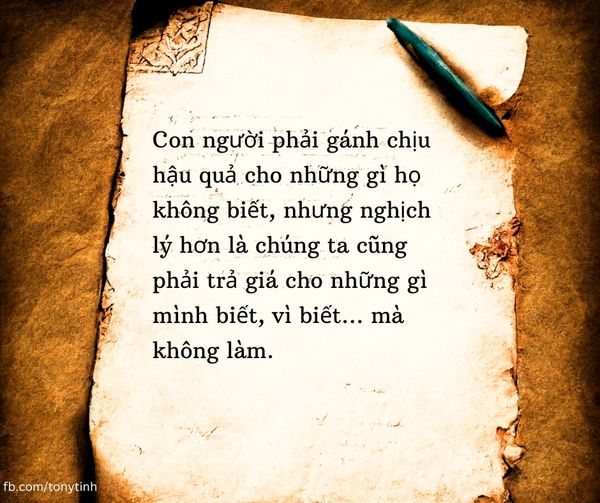 Con người phải gánh chịu hậu quả cho những cái họ không biết, nhưng nghịch lý và đáng buồn hơn là chúng ta cũng phải trả giá cho những gì mình biết, vì biết mà không làm. Biết nhưng không làm này do hai nguyên nhân. Một là do thói quen được hình thành quá lâu nên nó đã trở thành nhân cách. Hai là do cái Tôi quá lớn, làm cho cái Tâm nhận biết của mình bị lu mờ qua một thời gian dài. Hai nguyên nhân này lại có quan hệ mật thiết với nhau, đan xen vào nhau. Không thay đổi được thói quen vì cái Tâm lu mờ. Cái Tâm lu mờ vì tại cái Tôi muốn thể hiện, nó cho nó biết, nó cho nó khác người thường, nó cho nó hay, nó cho nó đúng nên nó không chịu thay đổi.