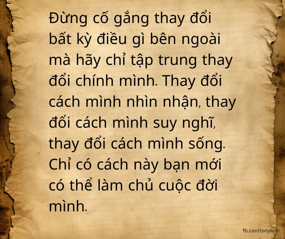 Đừng cố gắng thay đổi bất kỳ điều gì bên ngoài mà hãy chỉ tập trung thay đổi chính mình. Thay đổi cách mình nhìn nhận, thay đổi cách mình suy nghĩ, thay đổi cách mình sống. Chỉ có cách này bạn mới có thể làm chủ cuộc đời mình.