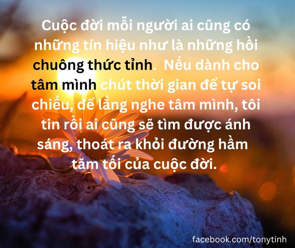 Cuộc đời mỗi người ai cũng có những tín hiệu như là những hồi chuông thức tỉnh, chỉ là mình quá bận rộn lo cơm áo gạo tiền, lo lợi danh nên vô tình mình có thể đã bỏ qua những âm thanh cảnh tỉnh mầu nhiệm đó. Nếu dành cho tâm mình chút thời gian để tự soi chiếu, để lắng nghe tâm mình, tôi tin rồi ai cũng sẽ tìm được ánh sáng, thoát ra khỏi đường hầm vô minh tăm tối của cuộc đời.