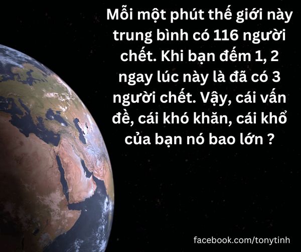 Mỗi một phút thế giới này trung bình có 116 người chết, mỗi một giây là 1.6 người. Khi bạn đếm 1, 2 ngay lúc này là đã có 3 người chết. Vậy, vấn đề của mình, cái ‘’problem’’ của bạn nó bao lớn ? Mỗi một ngày trung bình có 25,000 người chết vì đói, thiếu dinh dưỡng, trong đó bao gồm gần 10,000 trẻ em. Vậy, nếu so sánh thì cái ‘’problem’’ của bạn nó bao lớn?