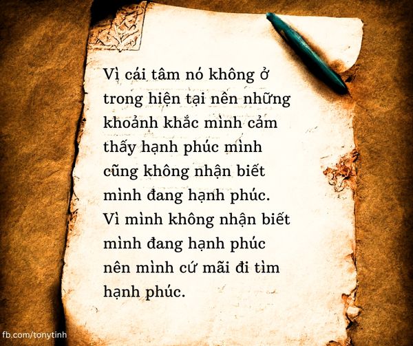 Khoảnh khắc của cái cảm thấy hạnh phúc nó cũng vô thường, tức nó đến rồi nó cũng sẽ đi, nó không như vậy mãi. Điều quan trọng là khi nó đã ở đó, mình đã có hạnh phúc mà mình không nhận thấy, vì cái tâm của mình ít khi nào nó ở yên một chỗ trong hiện tại. Vì cái tâm nó không ở trong hiện tại, nó không ở đó, nên những khoảnh khắc mình cảm thấy hạnh phúc mình cũng không nhận biết được mình đang hạnh phúc. Vì mình không nhận biết mình đang hạnh phúc, mình không nhận biết mình đã có hạnh phúc nên cứ mãi đi tìm. Đi tìm hoài nhưng không thấy nên mình nói cuộc đời mình không hạnh phúc.