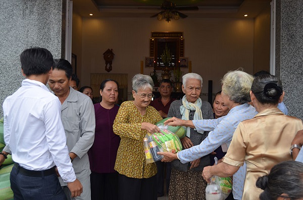 Gia đình anh Tỉnh trao tận tay các phần quà cho những người già neo